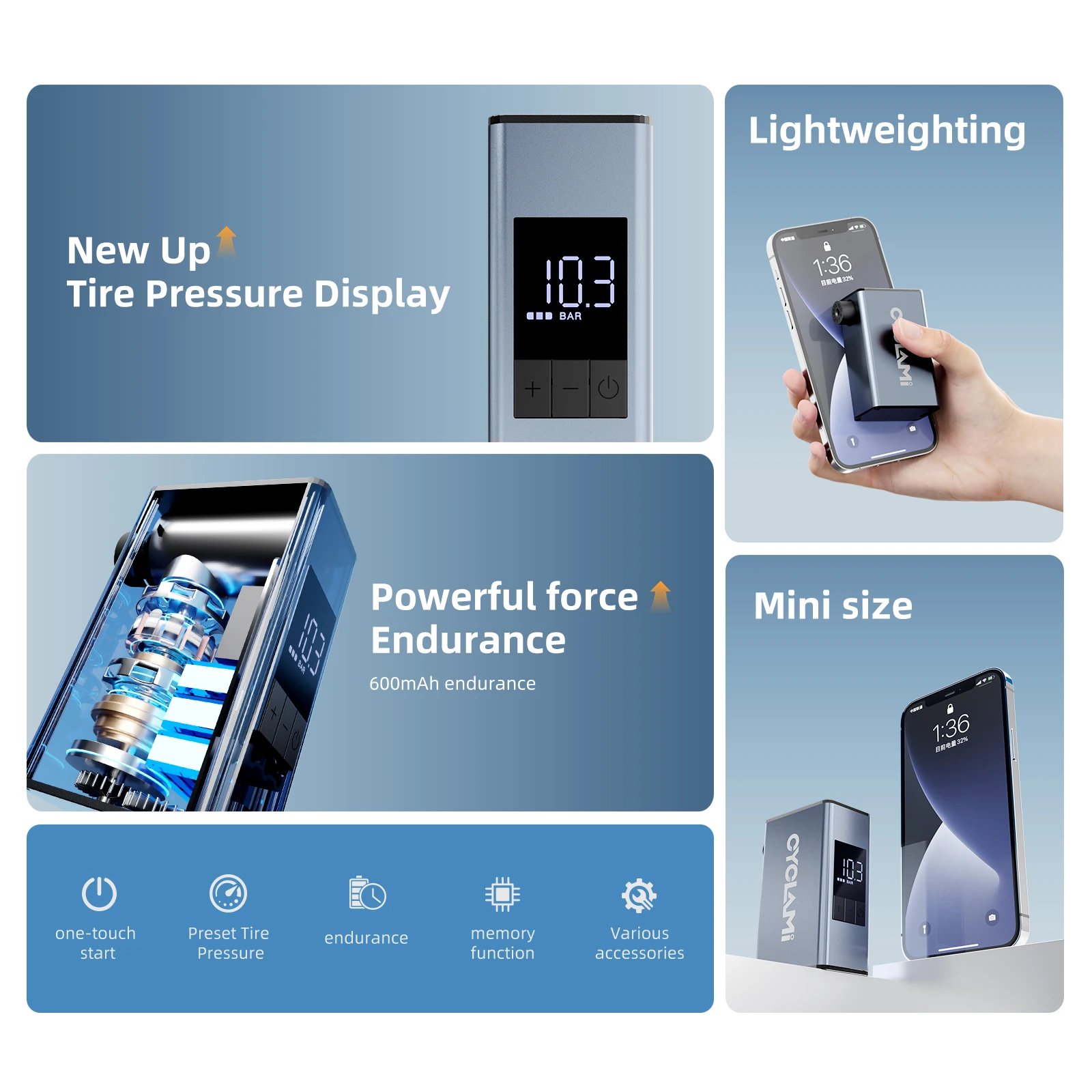 10,3 Bar Aluminiumlegierung Elektrische Luftpumpe Tragbare Automobil Motorrad Luft Wiederaufladbare Reifenfüller Schrader Ventil CYCLAMI - TopDealBox