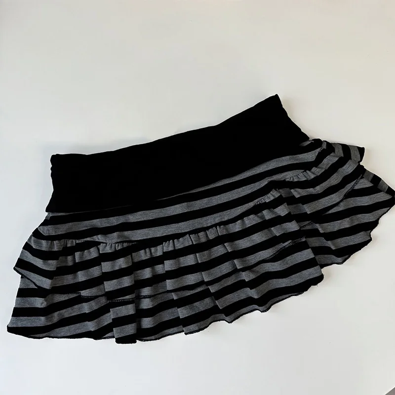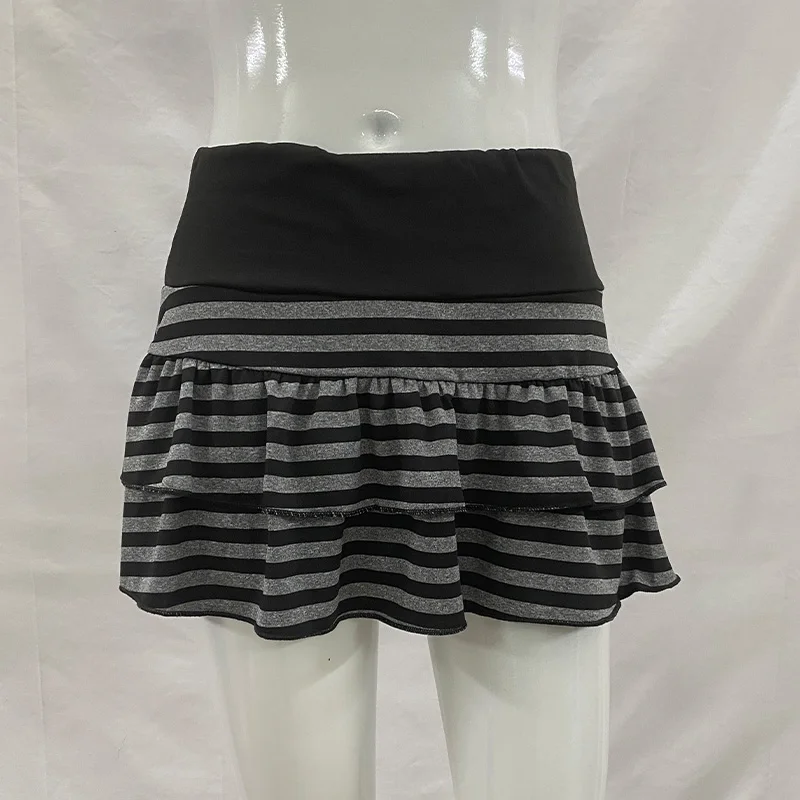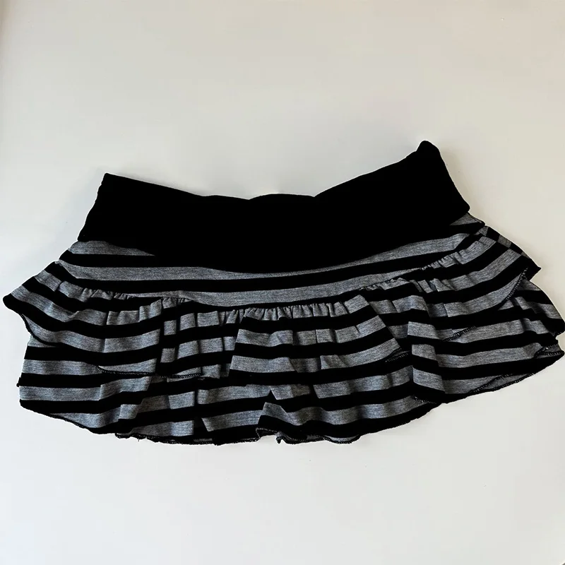 2026 Sommer neue Damenbekleidung Y2K Grunge schwarz und grau gestreifter Rüschen-Minirock hohe Taille elastische Taille enger A-Linien-Rock - TopDealBox