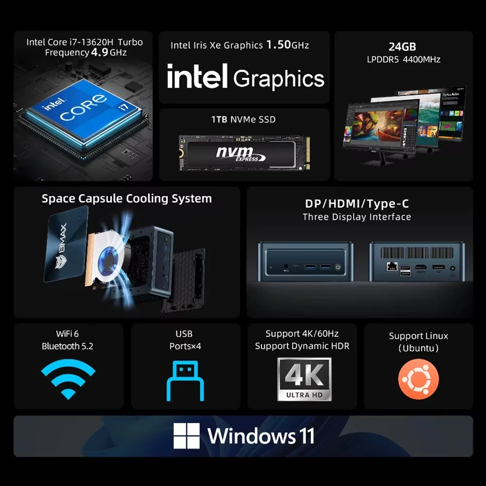 ♡SchnellansichtBMAX B9 Plus Mini-PC Intel Core i5-1250P-Prozessor der 12. Generation Intel Iris Xe Graphics 24 GB LPDDR5 512 GB NVMe SSD Windows 11 WIFI 6454.99 EUREUR 699.98Heiß★★★★★★4.8