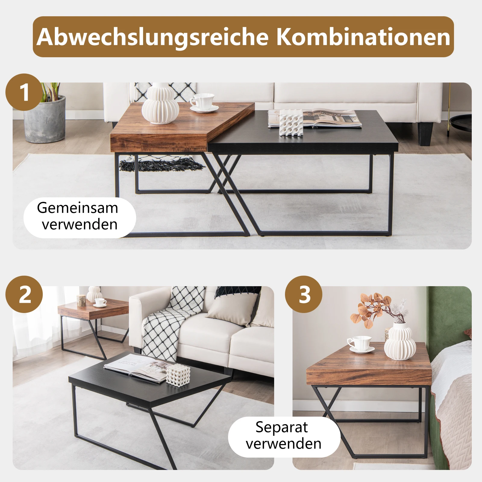 Couchtisch Holz, 2er Satztisch Set industriell, Beistelltisch mit Metallrahmen, 60 x 60 x 46cm + 80 x 60 x 42cm - TopDealBox