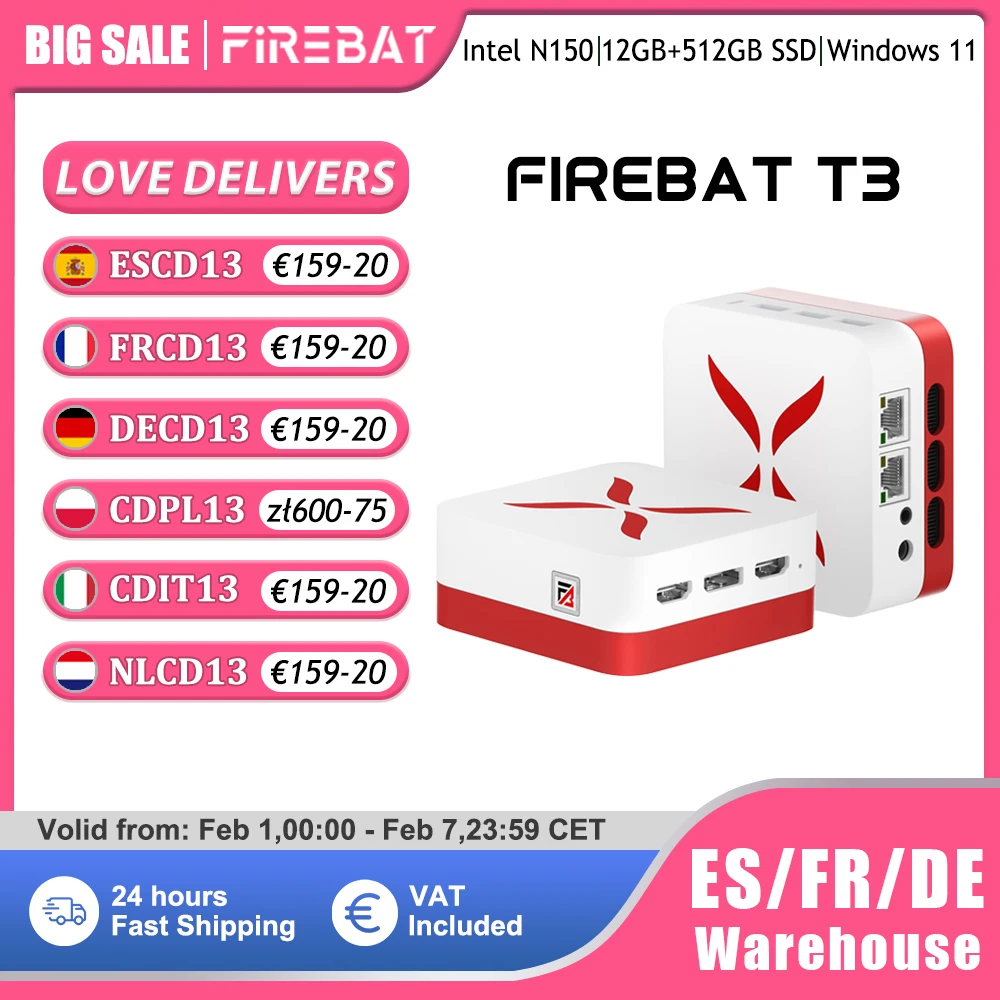 ♡SchnellansichtFIREBAT T3 Mini-PC Intel N150 CPU Windows 11 12 GB DDR5 RAM 512 GB SSD Wi-Fi 5 Bluetooth 4.2 HDMI DP USB Desktop-Computer Bare159.25 EUREUR 515.45Heiß★★★★★★4.9
