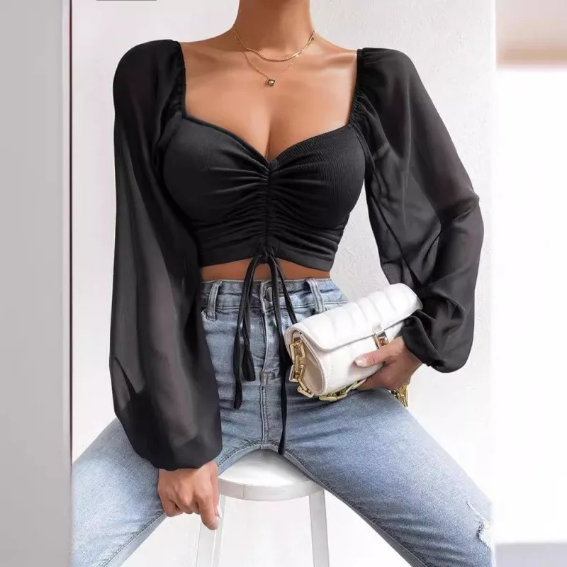 Frauen Frühling Herbst Lange Puff Sleeve Tops Tees Lose Chiffon Stricken Tiefem V-ausschnitt T-shirts Fashion Solid Casual Raffen T shirts - TopDealBox