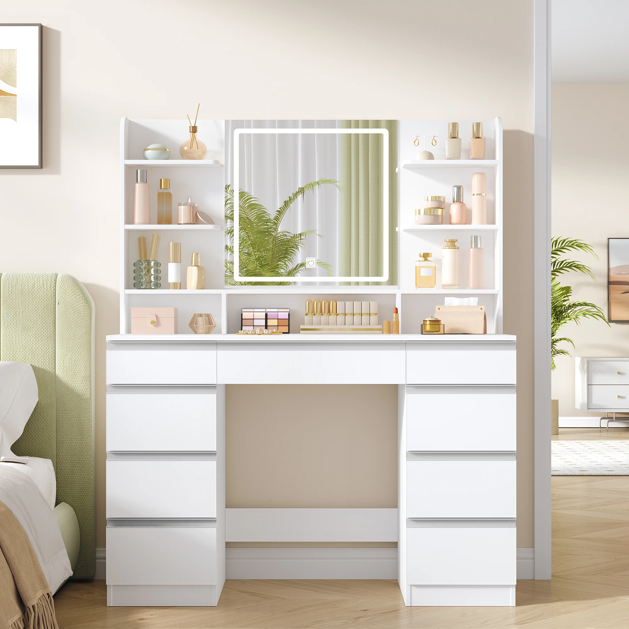 ♡SchnellansichtHzuaneri Schminktisch mit Spiegel und 10 LED-Leuchten, Schminktisch mit 3 Regalen und 4 offenen Fächern, mit großer Schublade65.99 EUREUR 1073.42Heiß★★★★★★4.7