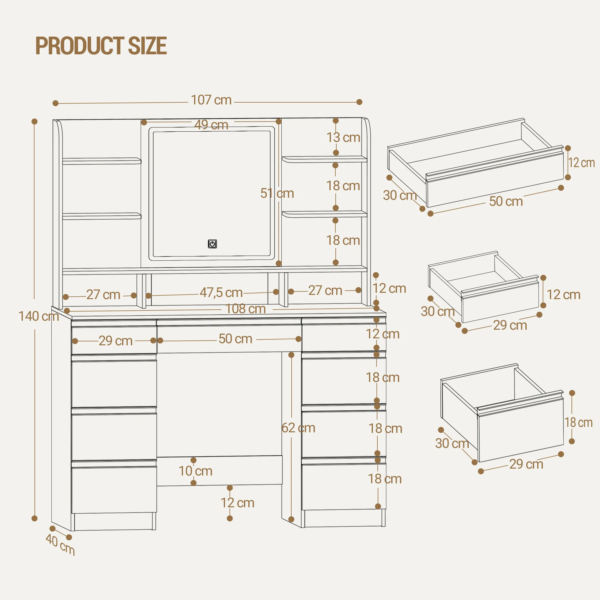 ♡SchnellansichtSchminktisch mit 10 LED-Lichtkugeln, Einstellbarer Helligkeit, Großem HD-Spiegel, 1 Großer Schublade und 8 Kleinen Schubladenschränken122.99 EUREUR 2096.40Heiß★★★★★★4.7