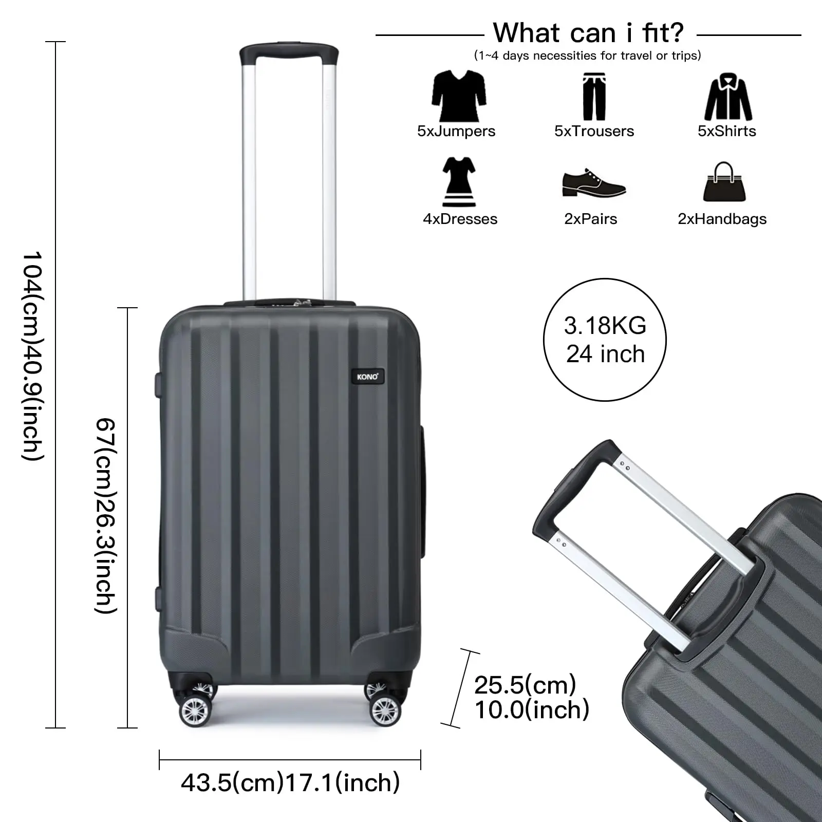 ♡SchnellansichtKono Hartschalen-Koffer ABS+PC: Handgepäck mit TSA-Schloss, 4 Spinnerrädern & Teleskopgriff, Kabinenmaß, Leichter Reisekoffer118.17 EUREUR 268.57Heiß★★★★★★4.6