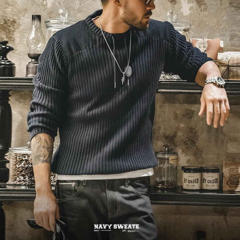 Maden Vertikal gestreifter Pullover O-Ausschnitt Slim Fit Herren Retro Strickpullover Patch Stitching Design Klassische Pullover Herrenbekleidung - TopDealBox