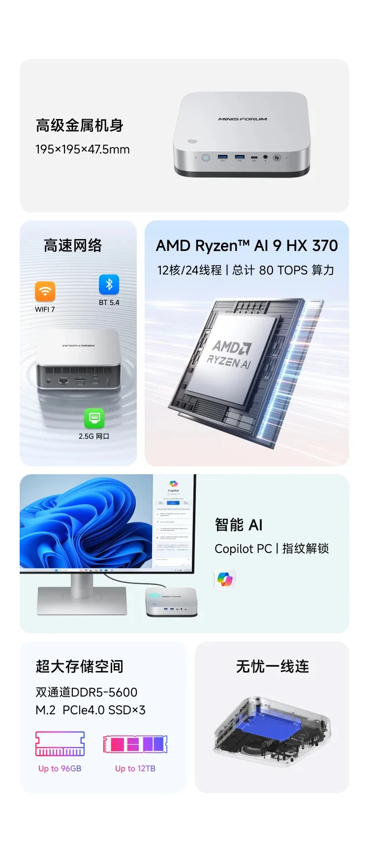 MINISFORUM AI X1 Pro Copilot AI PC AMD Ryzen AI 9 HX 370 Windows 11 DDR5 64GB Wifi7 BT5.4 135W 8K Desktop PC Gamer OCulink - TopDealBox