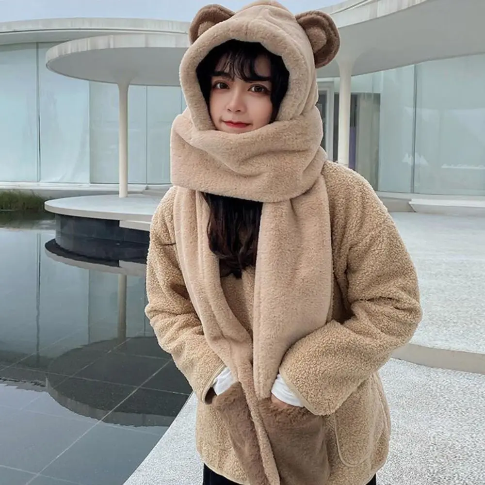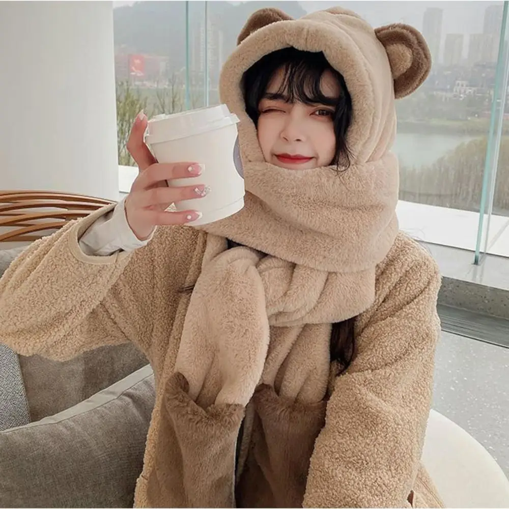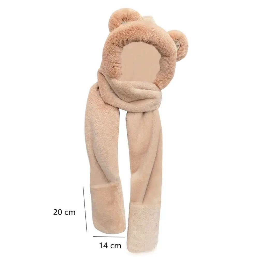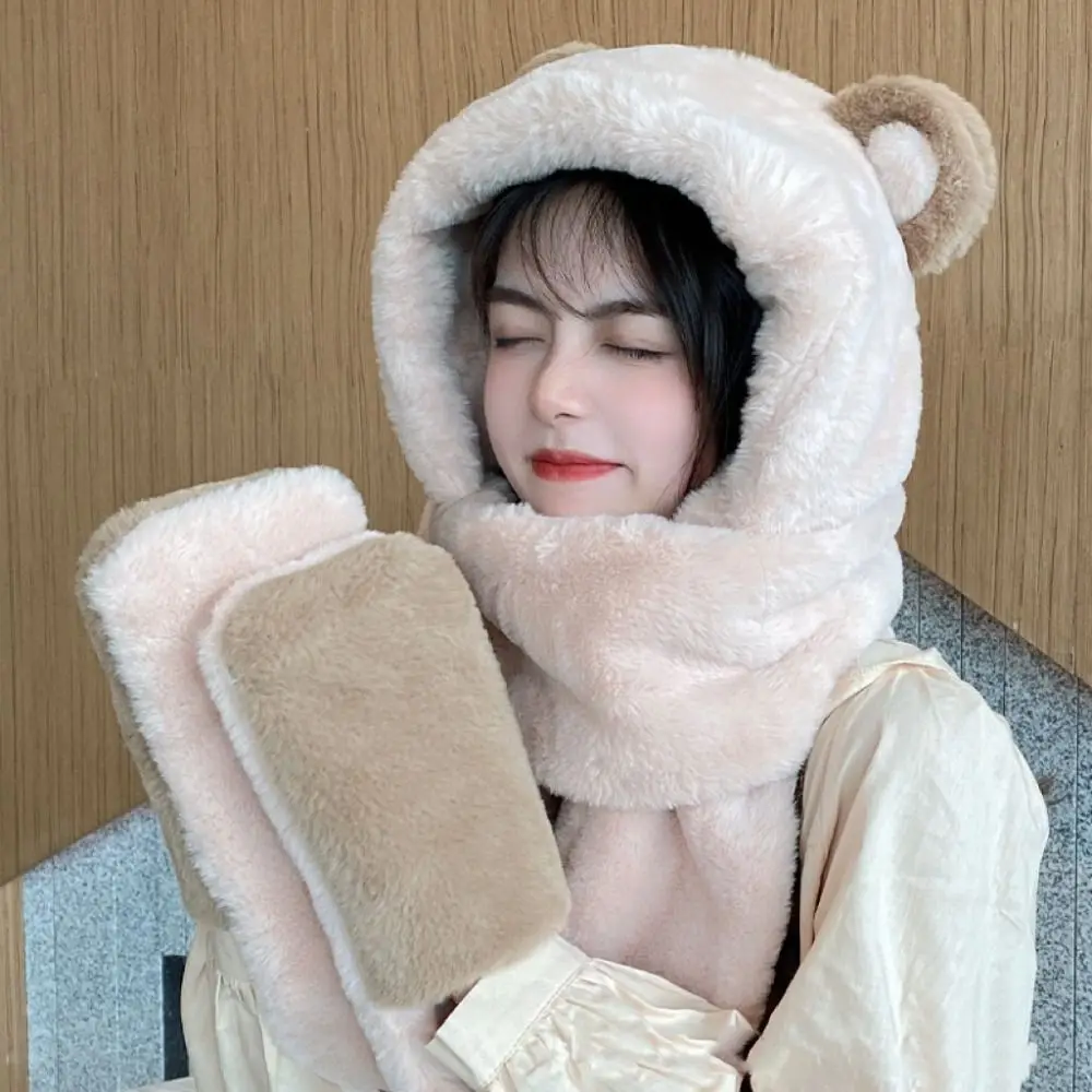 ↑Niedliche Cartoon Bären Ohren Plüsch Hut warme wind dichte Hut Schal Handschuhe Set weiche Gehörschutz kappe Frauen - TopDealBoxWinter-Reitmütze für Damen, Kapuze, Schal, Maske und Ohrabdeckung, dick, thermisch, winddicht, für Elektroroller, Outdoor, Radfahren, Wärme