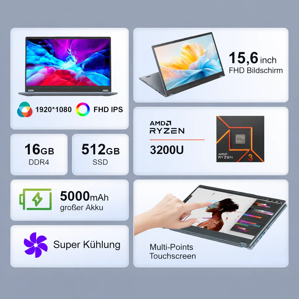 Ninkear YBOOK 15 Laptop 15.6 Zoll Touchscreen 360° klappbar 2-in-1 Yoga-Modus 16GB RAM 512GB SSD AMD Windows 11 Notebook Ultrabook Convertible für Büro Studenten Multimedia - TopDealBox