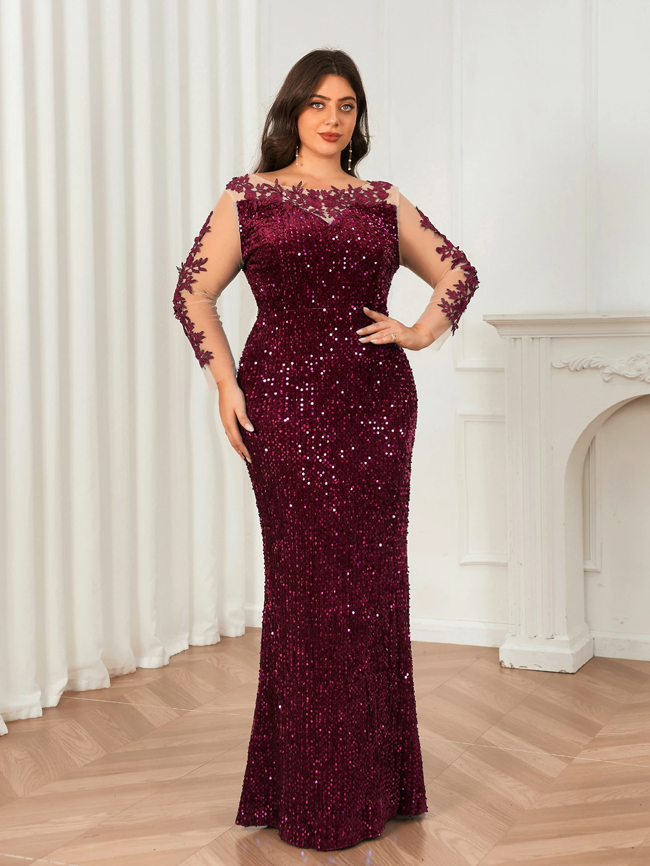 O-Ausschnitt Kurve Langes Abendkleid aus Samt mit Pailletten und Spitze, bodenlanges, rückenfreies Maxikleid - TopDealBox