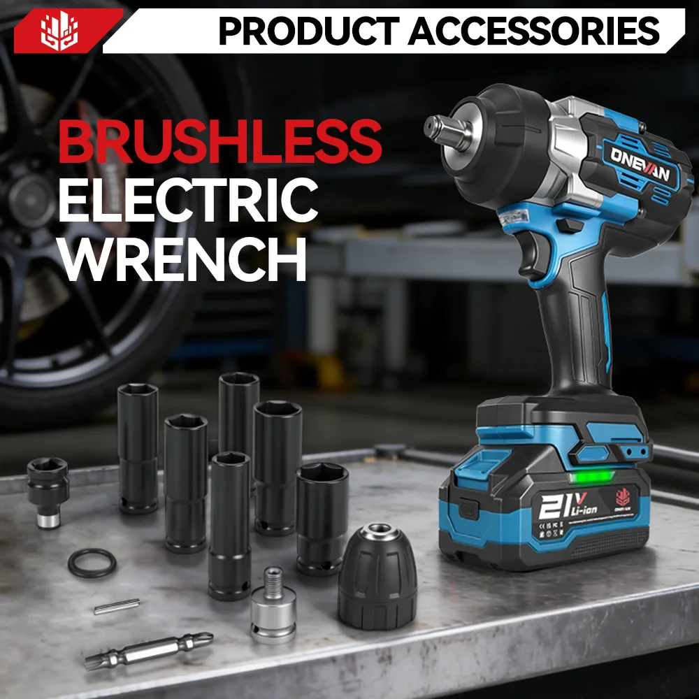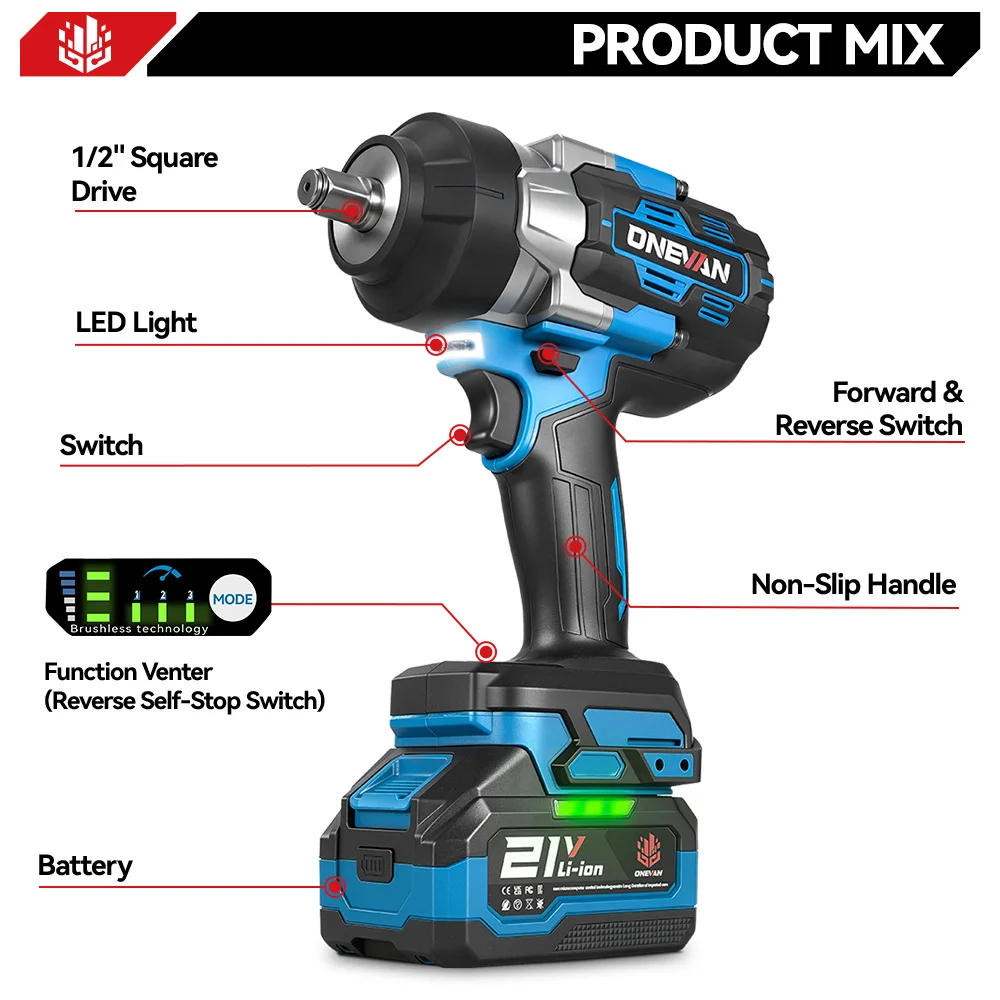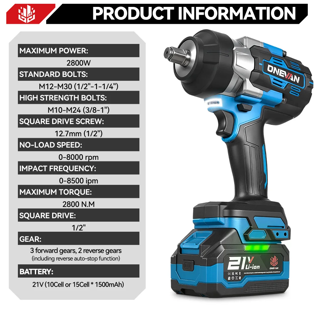 ONEVAN 2800N.M Hochleistungs-Akku-Schlagschrauber, bürstenlos, 1/2 Zoll, Schraubendreher, Schlagbohrer, kompatibel mit Makita 18V Akku - TopDealBox