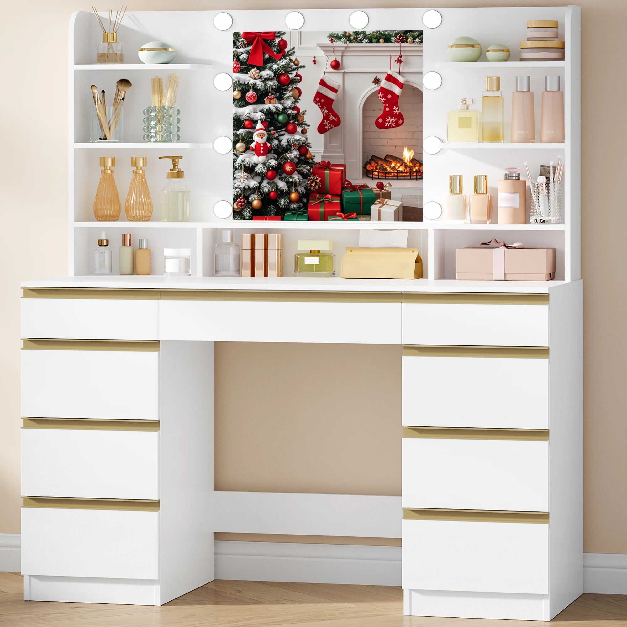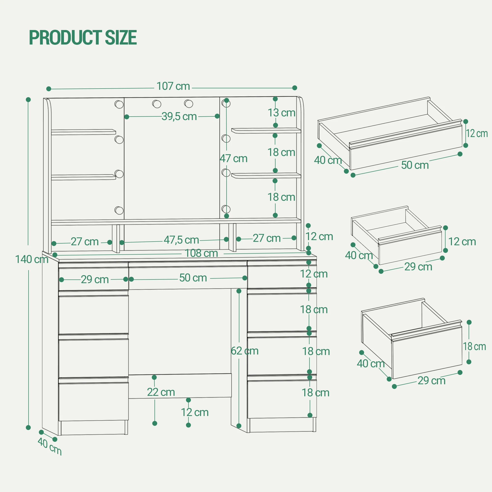 ♡SchnellansichtGroßer Schminktisch mit LED-Beleuchtung, 3 Farben, Helligkeitsregelung, mit Spiegel, 9 Schubladen, 9 offenen Regalen116.39 EUREUR 2390.36Heiß★★★★★4.3