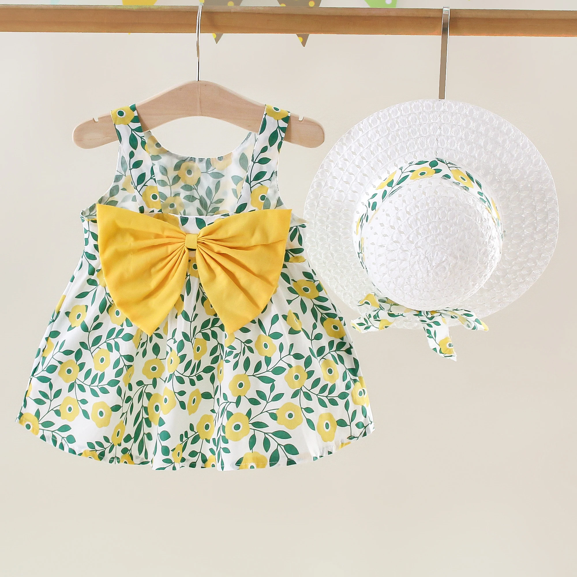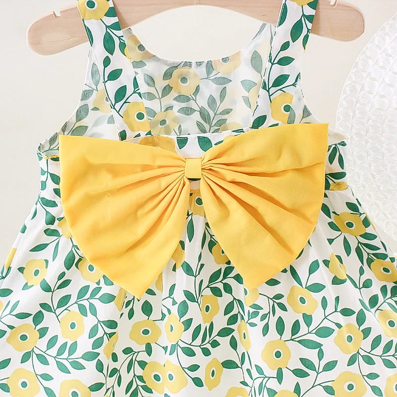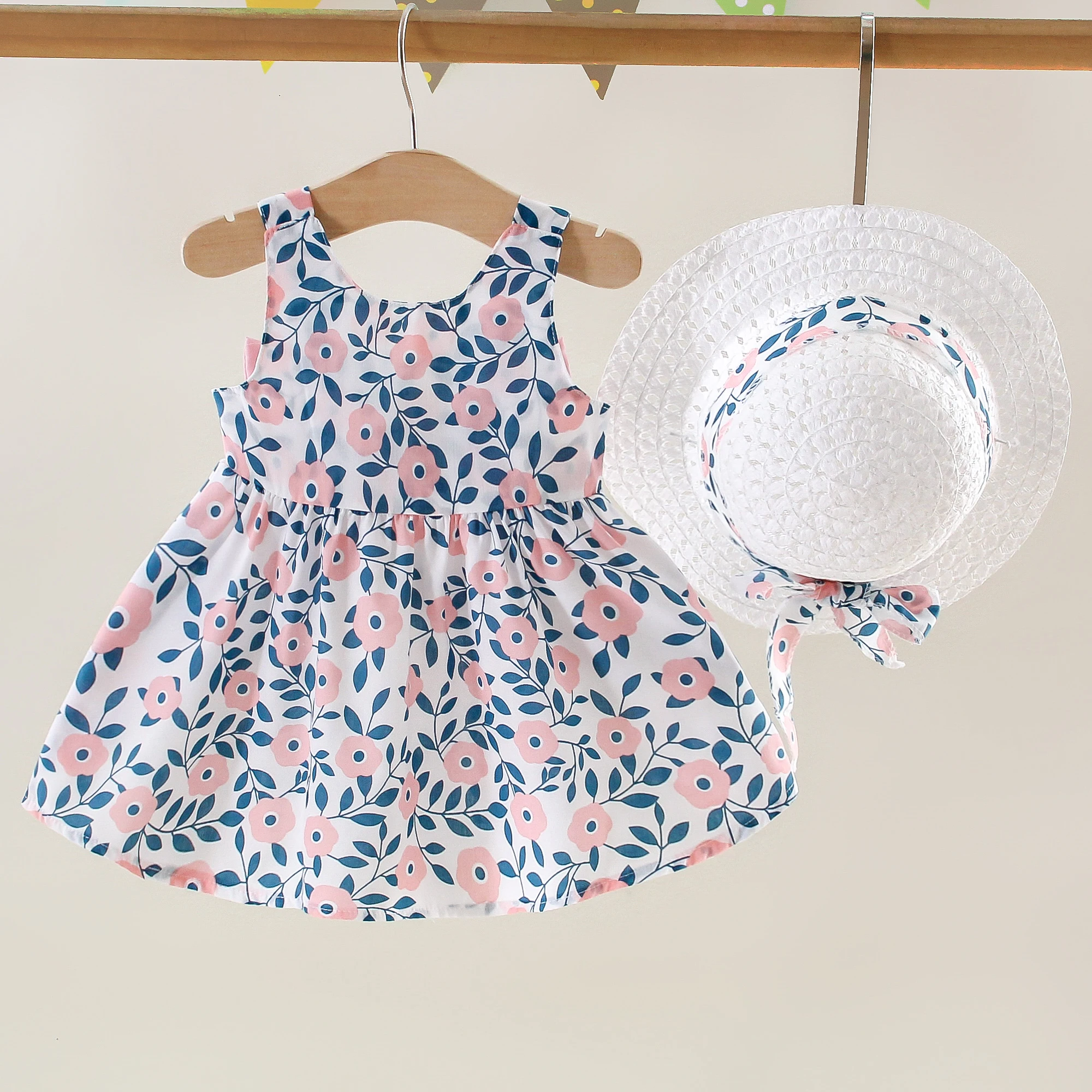 Sommer Neue Mädchen Kleid Neckholder Band Band Voller Druck Floral A-linie Kleid Geburtstag Party Team Kleid + Hut Bogen Band - TopDealBox