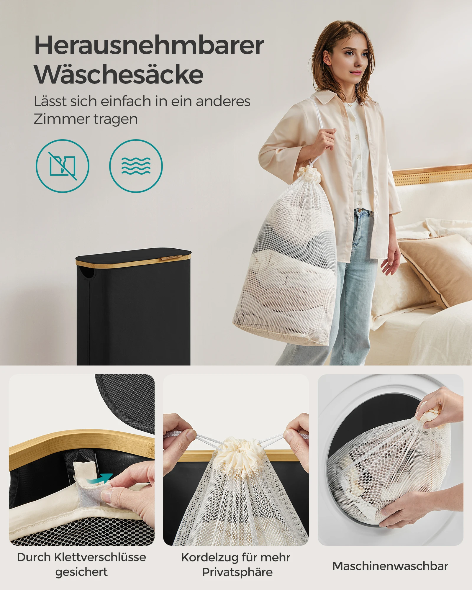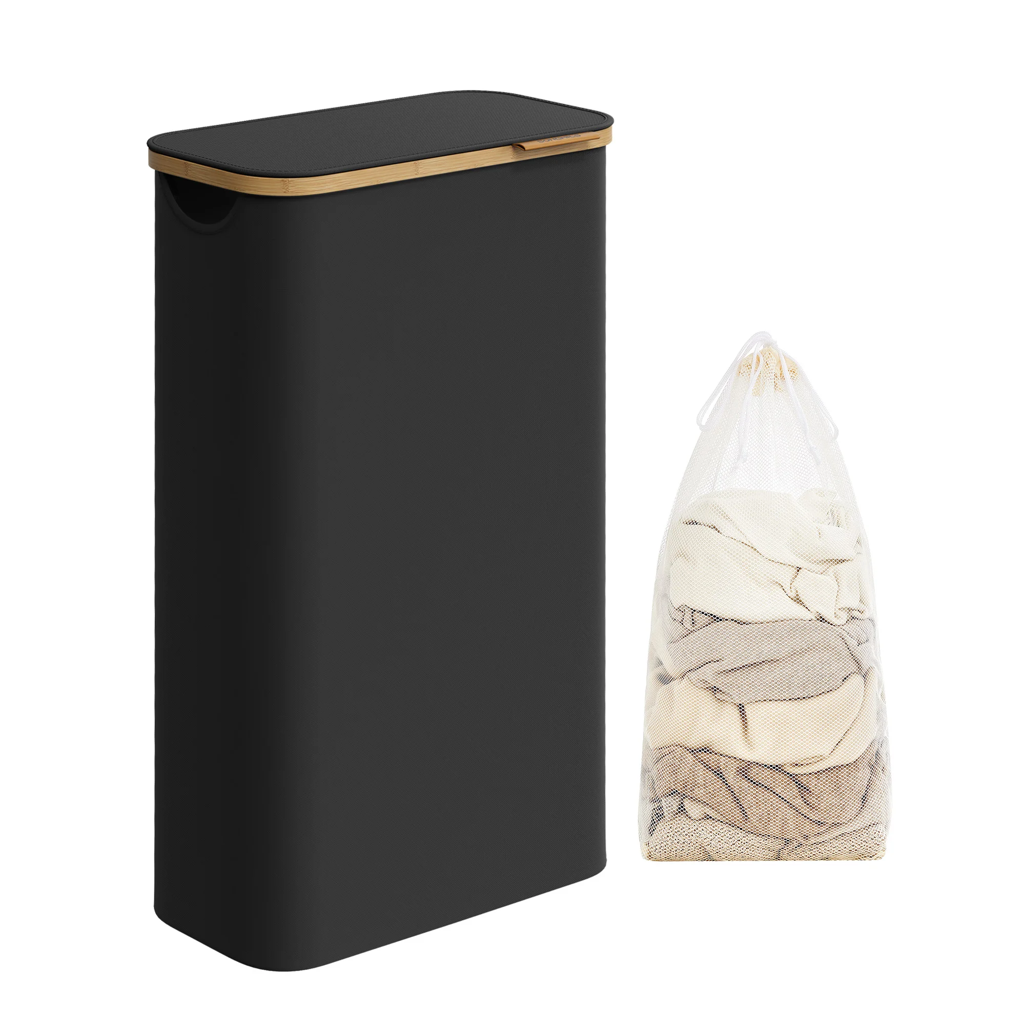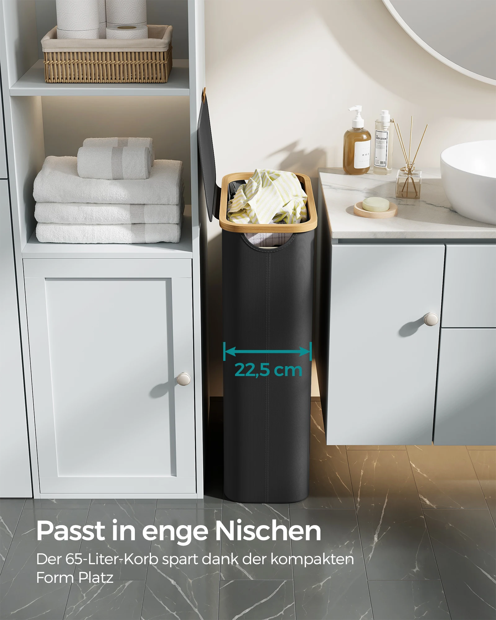 SONGMICS Wäschekorb mit Deckel, Wäschesammler 65 L, herausnehmbarer Wäschesack,Oxford-Gewebe,Griffe aus Bambus, zusammenklappbar - TopDealBox